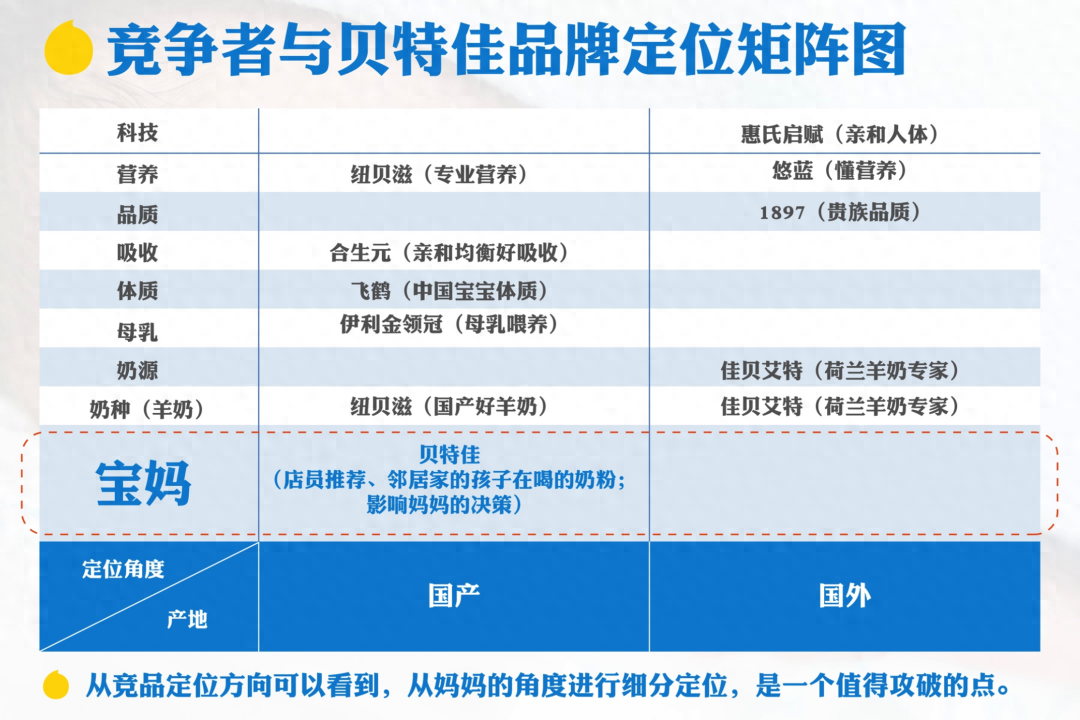 貝特佳想要依托于自己的技術(shù)和品質(zhì),打造一個全新的奶粉品牌,能夠滿足不同渠道和人群需求的全新品牌。而如何選擇自身賽道?如何制定與下沉渠道匹配的戰(zhàn)略路徑?顯得尤為重要。奶粉市場競爭激烈,巨頭林立,如何在這樣一個市場容量巨大,但市場成熟度非常高的市場破局和突圍!值得我們深度調(diào)研和思考:想以成分作為突破奶粉市場的核心非常困難,如DHA&ARA和膽堿、OPO結(jié)構(gòu)脂等等,飛鶴、金領(lǐng)冠、紐貝滋、貝因美、圣元等競爭品都具有,相對透明化,不具備核心競爭力,打造差異化異常困難,在這樣一個成熟市場,作為新品牌,我們需要選擇一個既能符合未來趨勢,競爭又相對較弱的細(xì)分市場和賽道。